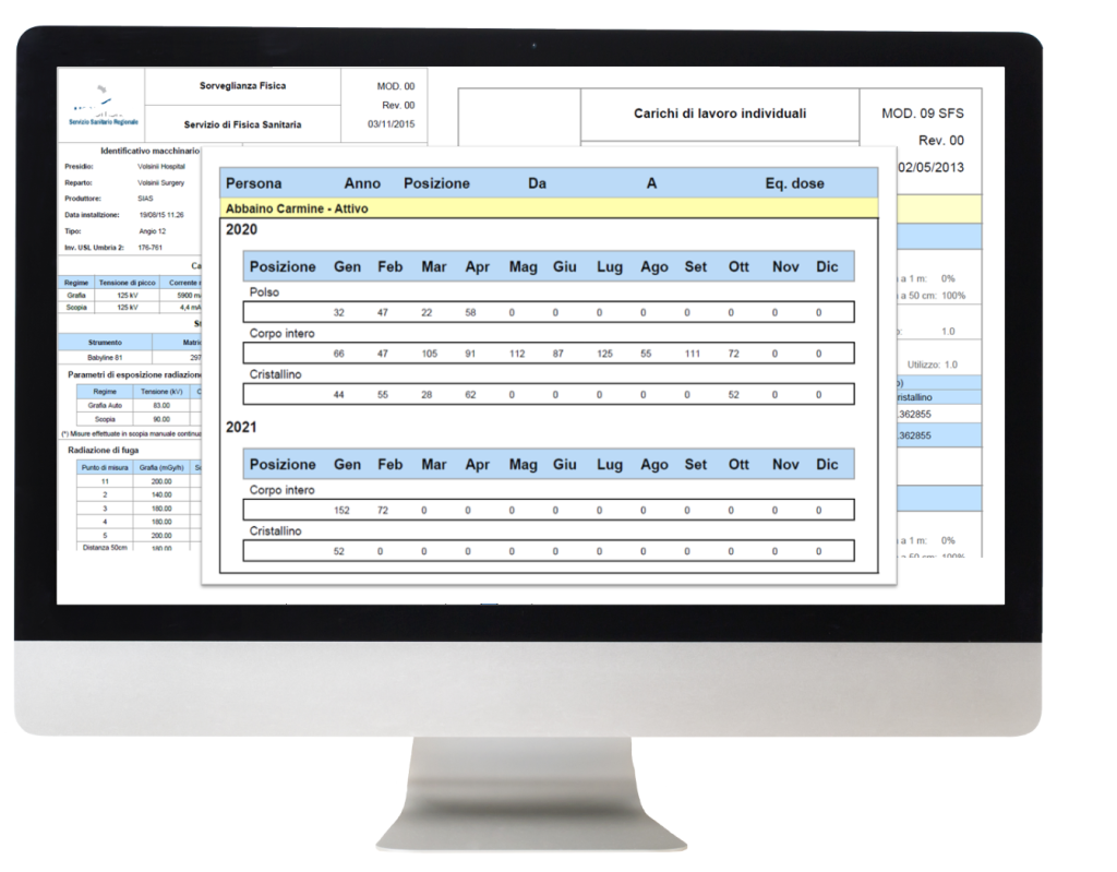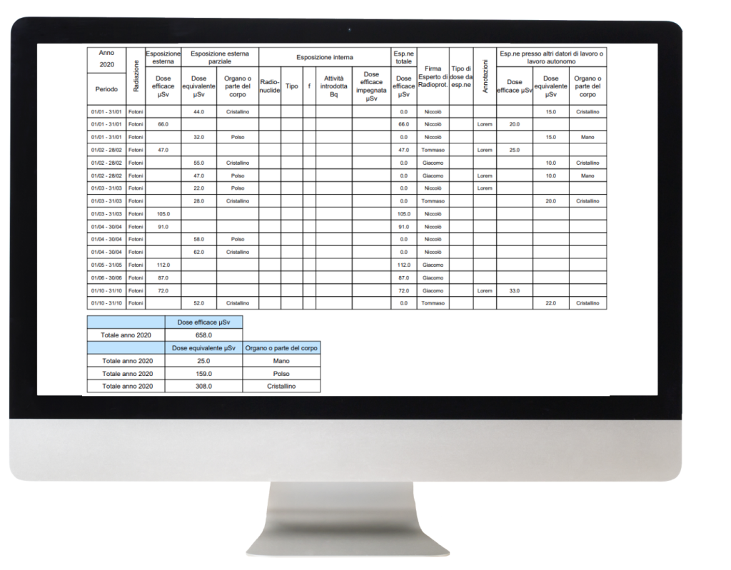 La gestione di tutti gli aspetti per la redazione ed emissione della Scheda Personale Dosimetrica avviene nel pieno rispetto dell’allegato XI del D.Lgs. 101/2020 e s.m.i., con piena tracciabilità delle operazioni. Infatti viene gestito il “tracking” all’interno della scheda di tutta la storia del radioesposto: dosi, dati occupazionali e le relative classificazioni, indicazione dei rispettivi Esperti Qualificati e l’indicazione di altre attività esponenti contemporanee, ecc. È sempre possibile inserire dati pregressi di classificazione e di dose, con il dettaglio previsto dalla sopra citata normativa. Sono quindi visualizzabili e gestibili, anche a posteriori, i dati per periodo relativi alla radiazione, all’esposizione esterna in termini di dose efficace e di dosi equivalenti per ciascun organo, alla registrazione delle misurazioni per le esposizioni interne, ai dati di esposizione acquisiti da altri datori di lavoro o dichiarati per le attività di lavoro autonomo esterne alla struttura. All’interno il sistema calcola l’esposizione totale per periodo e le dosi equivalenti ed efficaci complessive di ciascun anno.